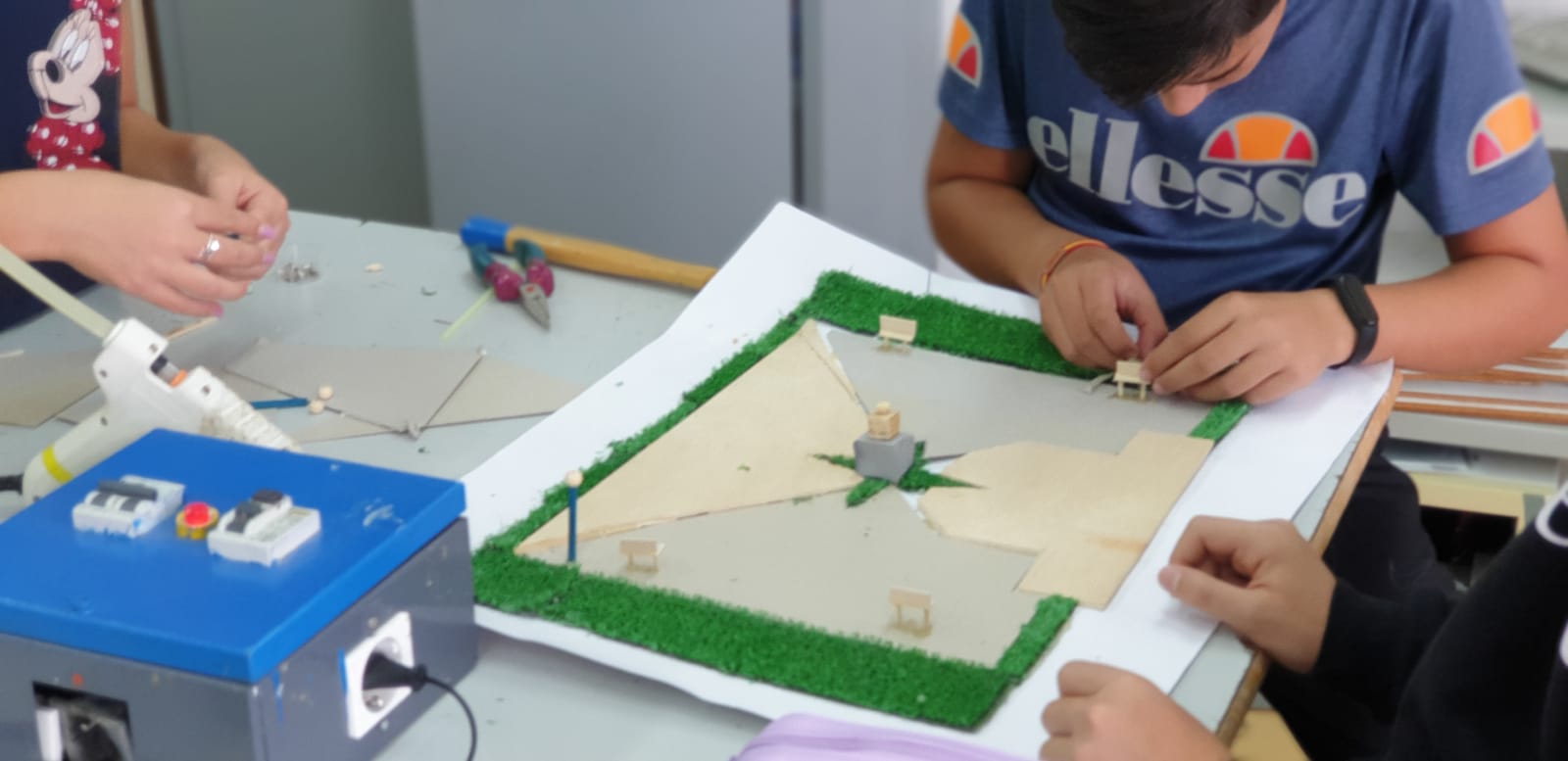 Tenemos que construir los bancos, fuentes para beber y papeleras y situarlos según nuestro croquis.